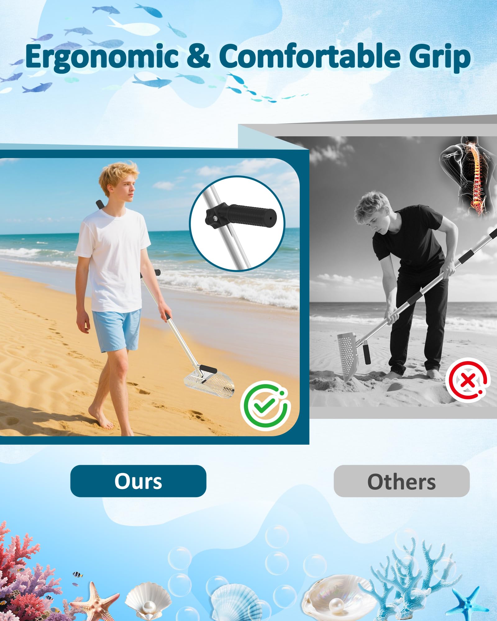 Rugged stainless scoop with detachable long handle for upright digging—no crouching. Hex-hole basket sheds sand fast so you can spot teeth and small finds in the wash.