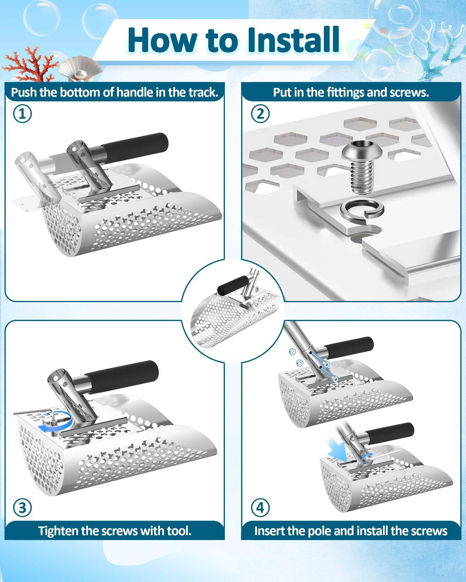 Sand scoop, long pole, handheld shovel head, screws/hardware.
