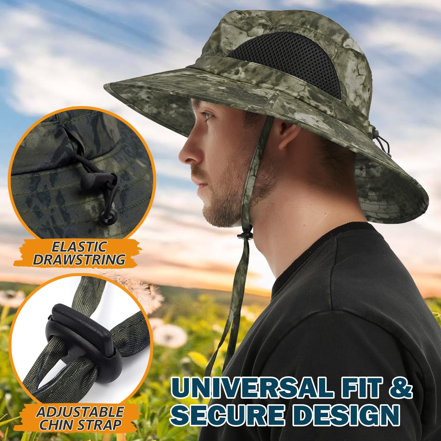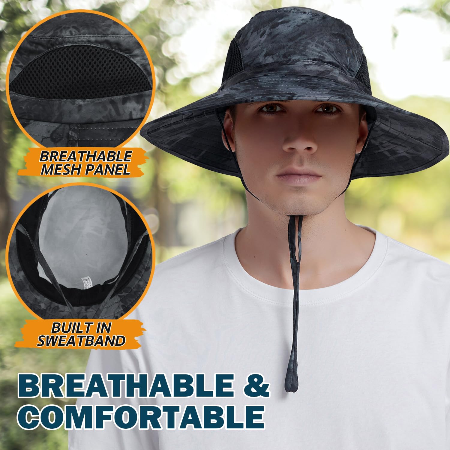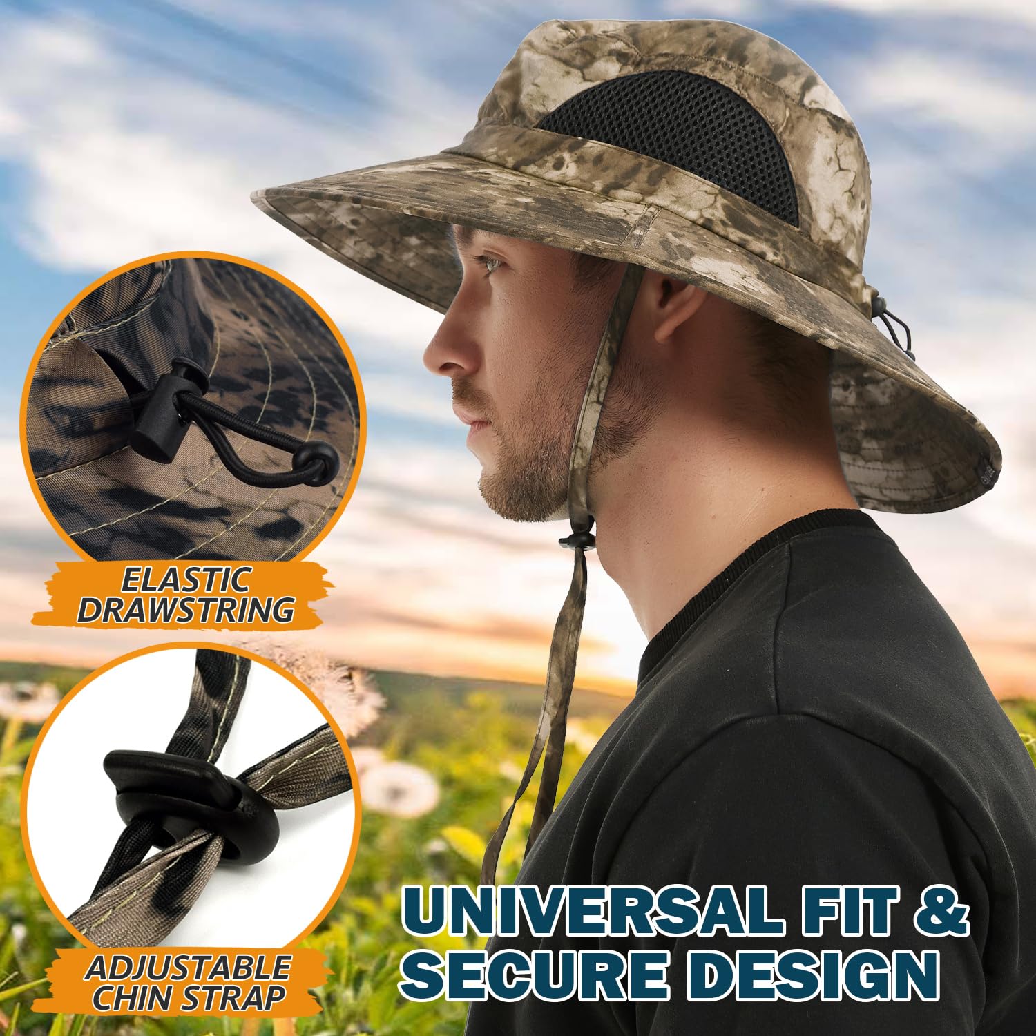 Lightweight bucket hat with a 3.9" brim for face/neck coverage on long beach and river hunts. Chin strap and rear drawcord keep it put in wind; mesh panels and sweatband keep you cool.
